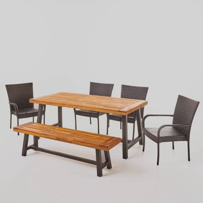 This clean and simple Christopher Knight Home Cooper 6pc Acacia Wood and Wicker Dining Set combines the functionality of wood and iron with the comfort of wicker. Complete with a table, bench, and 4 wicker dining chairs, this set offers comfortable seating for 6 in the great outdoors. Sure to complement any patio décor, this dining set offers you a stylish wooden design with the functionality of an iron framework and comfortable wicker chairs, guaranteed to give you a weather resistant set that will last your for years to come.