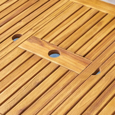 ACACIA WOOD TABLE: This durable hardwood is a solid, heavy frame that naturally withstands the elements and resists wear and tear. This includes an umbrella hole when expanded.